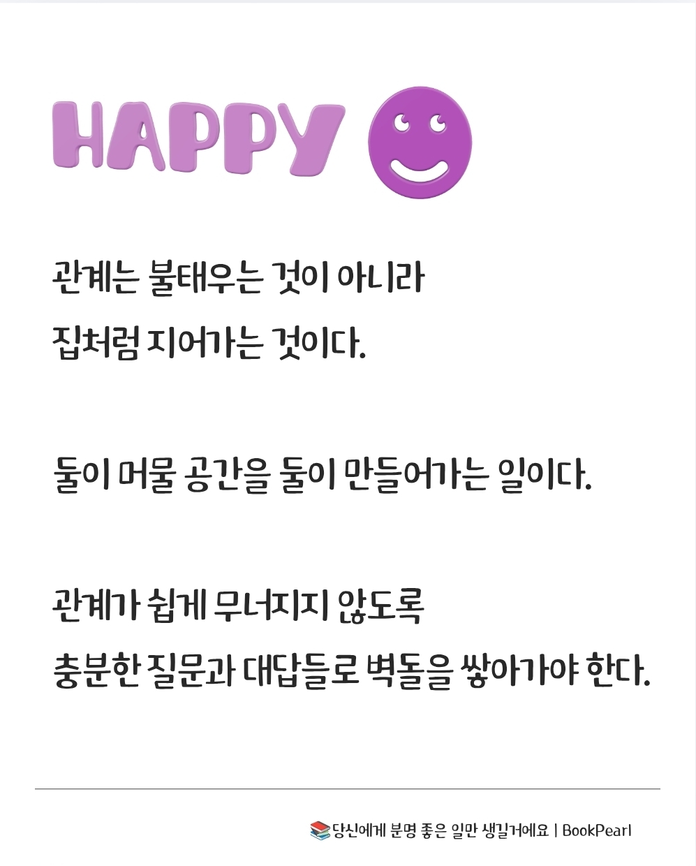 관계를 짓다 - 관계는 불태우는 것이 아니라 집처럼 지어가는 것이다. 둘이 머물 공간을 둘이 만들어가는 일이다. 관계가 쉽게 무너지지 않도록 충분한 질문과 대답들로 벽돌을 쌓아가야 한다. 110