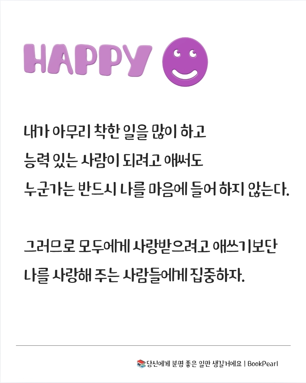 내가 아무리 착한 일을 많이 하고 능력 있는 사람이 되려고 애써도 누군가는 반드시 나를 마음에 들어 하지 않는다. 그러므로 모두에게 사랑받으려고 애쓰기보단 나를 사랑해 주는 사람들에게 집중하자. 126
