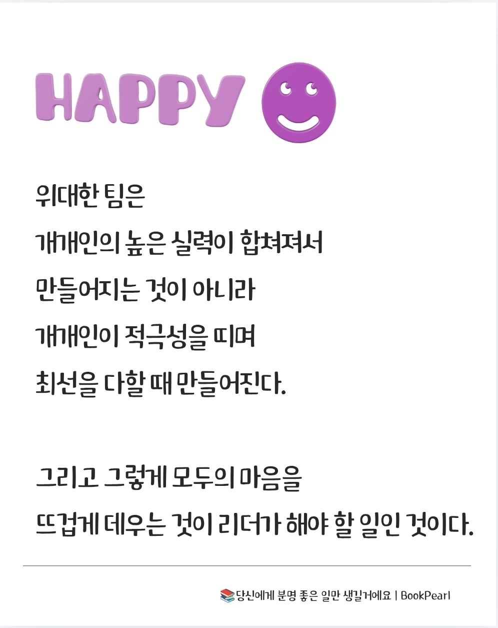 위대한 팀은 개개인의 높은 실력이 합쳐져서 만들어지는 것이 아니라 개개인이 적극성을 띠며 최선을 다할 때 만들어진다. 그리고 그렇게 모두의 마음을 뜨겁게 데우는 것이 리더가 해야 할 일인 것이다. 155