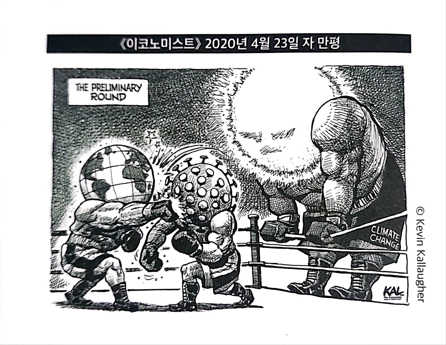 위위 그림은 코로나 감염병이 세상을 휩쓸 즈음, 이코노미스트지에 실린 그림입니다. 링 위에서 권투 시합을 하고 있는 선수들은 다름 아닌 지구와 코로나 바이러스입니다. 지난 3년 동안 인류는 코로나 바이러스로 인해 큰 고통을 겪었습니다. 확진자가 줄어드는 것 같다가도 새로운 변이 바이러스가 나오면 다시 세상이 멈춰버리는 악순환의 연속입니다. 그런데 코로나보다 훨씬 더 크고 무서운 상대인 기후변화가 인류를 기다리고 있습니다. 오죽하면 이 만평에 코로나와의 대결은 '예선전'이라고 붙였겠습니까. 이 그림은 과학 잡지나 환경 전문지가 아닌, 전 세계 기업인과 금융기관, 경제전문가들이 열독 하는 경제지에 실렸다는 사실에 주목해 주시기 바랍니다(220).