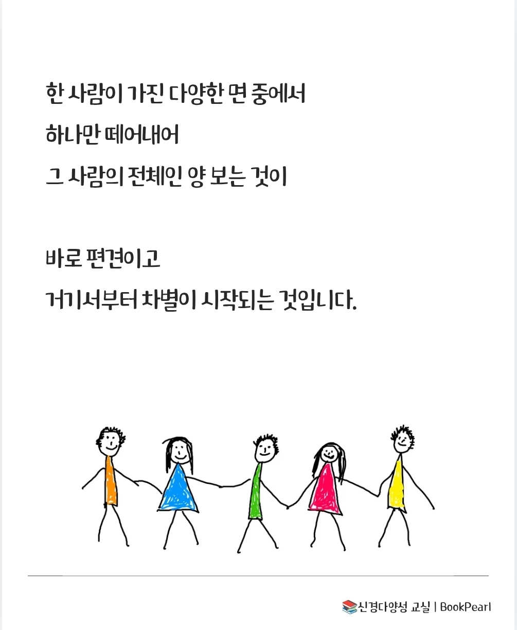 한 사람이 가진 다양한 면 중에서 하나만 떼어내어 그 사람의 전체인 양 보는 것이 바로 편견이고 거기서부터 차별이 시작되는 것입니다. 302