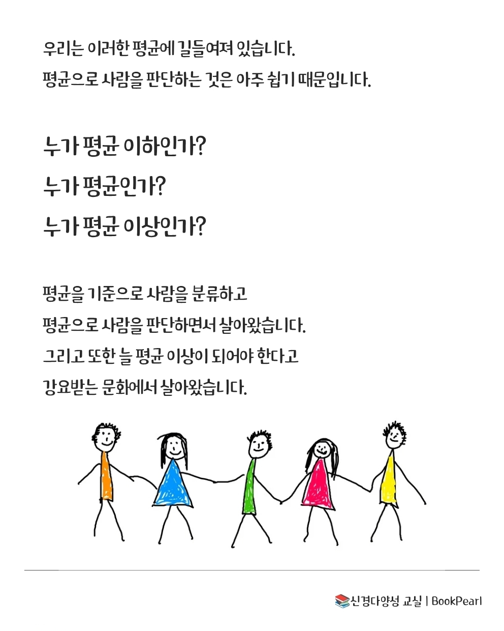 우리는 이러한 평균에 길들여져 있습니다. 평균으로 사람을 판단하는 것은 아주 쉽기 때문입니다. 누가 평균 이하인가? 누가 평균인가? 누가 평균 이상인가? 평균을 기준으로 사람을 분류하고 평균으로 사람을 판단하면서 살아왔습니다. 그리고 또한 늘 평균 이상이 되어야 한다고 강요받는 문화에서 살아왔습니다. 66