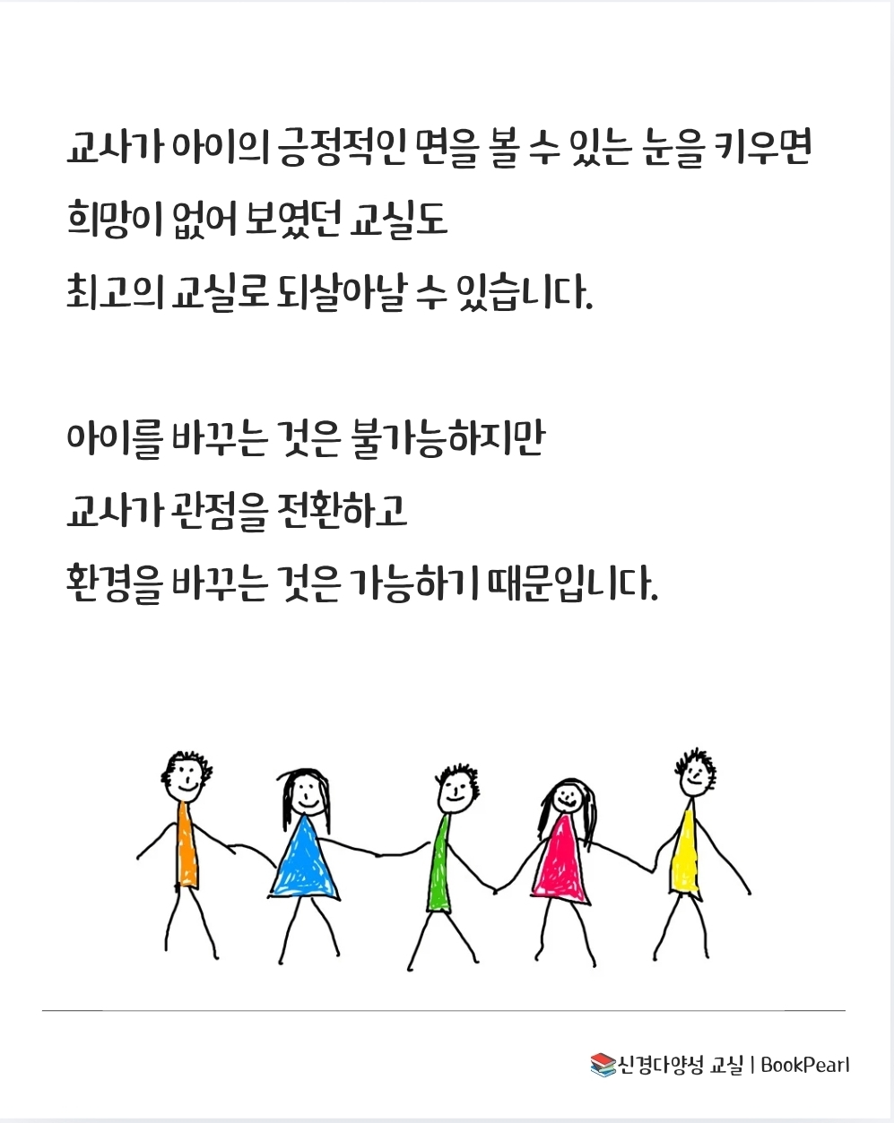 교사가 아이의 긍정적인 면을 볼 수 있는 눈을 키우면 희망이 없어 보였던 교실도 최고의 교실로 되살아날 수 있습니다. 아이를 바꾸는 것은 불가능하지만 교사가 관점을 전환하고 환경을 바꾸는 것은 가능하기 때문입니다. 27