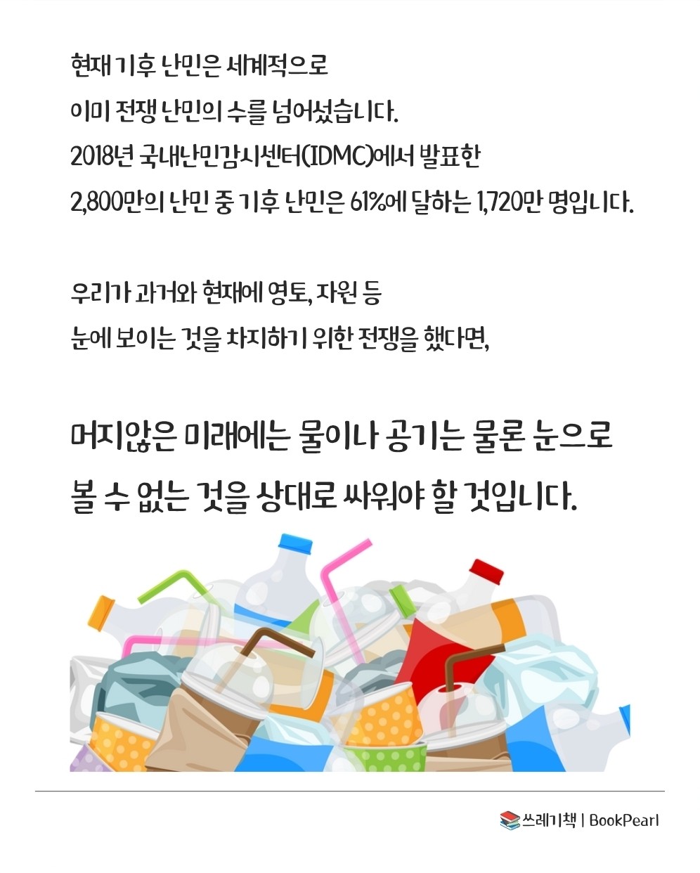 현재 기후 난민은 세계적으로 이미 전쟁 난민의 수를 넘어섰습니다. 2018년 국내난민감시센터(IDMC)에서 발표한 2,800만의 난민 중 기후 난민은 61%에 달하는 1,720만 명입니다. 우리가 과거와 현재에 영토, 자원 등 눈에 보이는 것을 차지하기 위한 전쟁을 했다면, 머지않은 미래에는 물이나 공기는 물론 눈으로 볼 수 없는 것을 상대로 싸워야 할 것입니다. 230